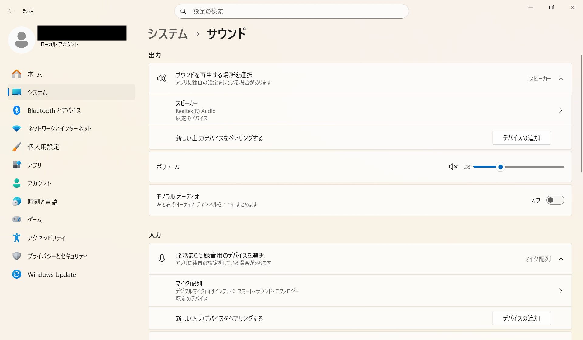 ② 出力および入力のデバイスをご確認ください。