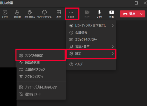 ① Teams画面上の […(その他)] > [設定] > [デバイスの設定] を開きます。