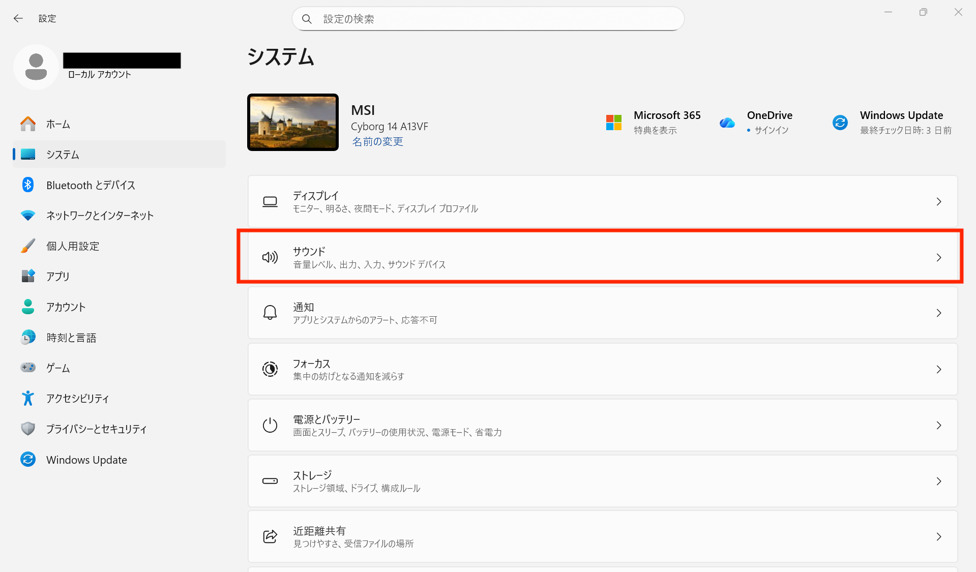 ① Windowsの「設定」画面から [システム] > [サウンド] を選択します。