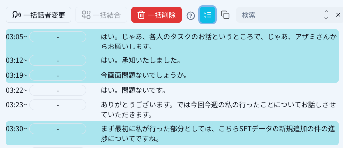 文字起こし結果の編集画面において、複数の発話(セグメント)を選択し、まとめて操作できる機能をリリースいたしました。