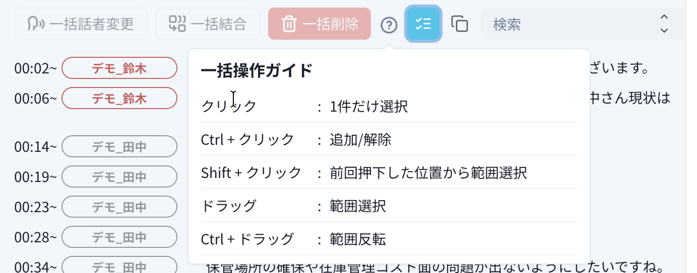一括削除: 相槌だけの行や、不要な会話部分などをまとめて削除し、議事録をクリーンアップできます。